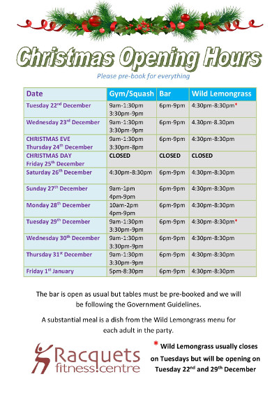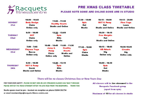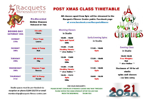 Classes during the week after Xmas will be streamed to the Racquets Facebook Page and will be available to everyone www.facebook.com/Racquetscentre